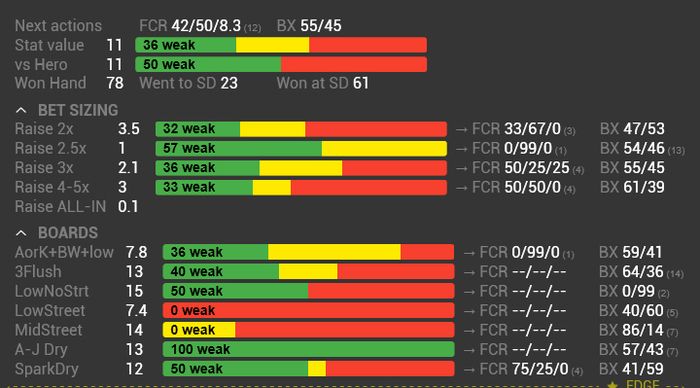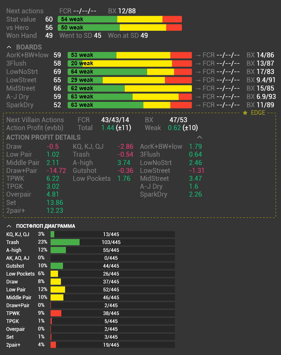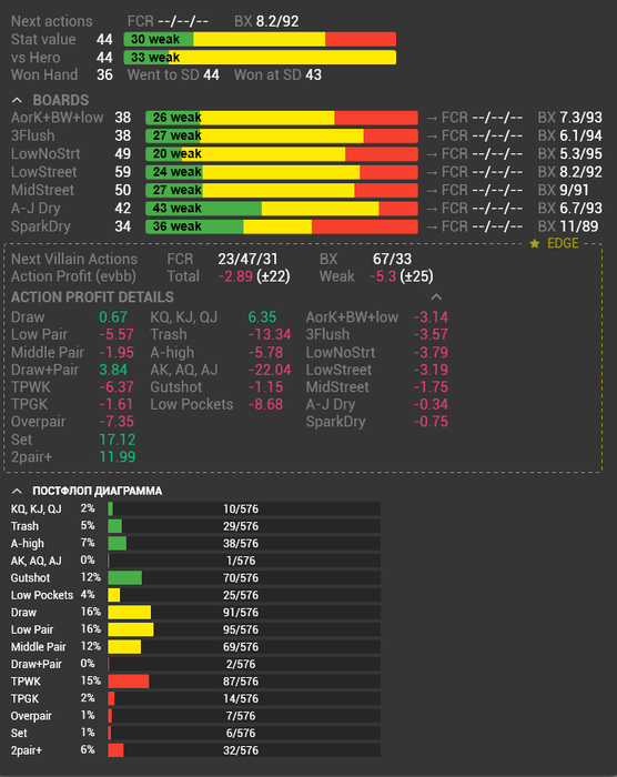 Для начала посмотрим как выглядит "средний" слабый игрок. Вы могли бы заметить, что эта информация не самая ценная, так как все такие игроки очень разные. С этим я полностью согласен, но наша цель сегодня - понять общие паттерны и в столкновении с новым оппонентом быстрее сориентироваться куда нам отклониться от нашей стратегии, также мы можем играть в дефолтную игру при условии, что мы уверены в природе нашего соперника, но не имеем на него адекватного количества рук