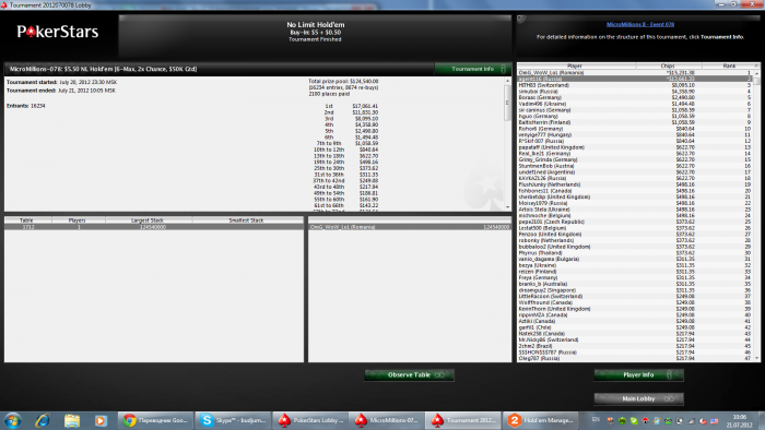 XOPOLLIO @ 21.7.2012 Oтмучился, HU уже играть не хотел, вышли со стеками 4 к 1 не в мою пользу, стеки подравнял и поделили, ну 1000 осталась за 1 место, сразу во 2 раздаче с ТП влетел под тузов