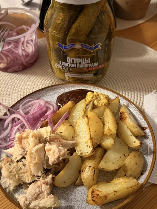 Скумбрия горячего копчения с картошечкой и маринованным луком + хрустящие огурчики