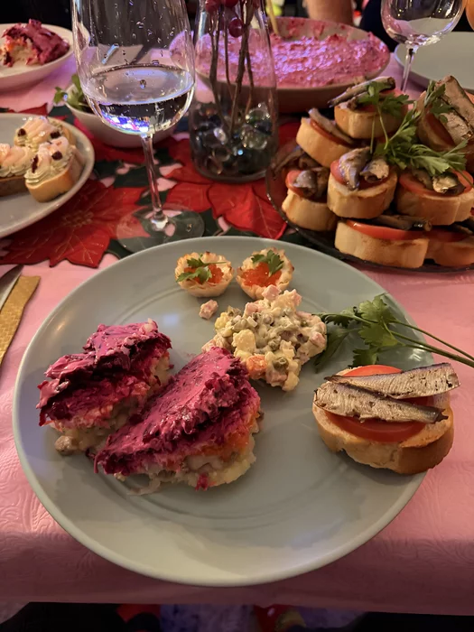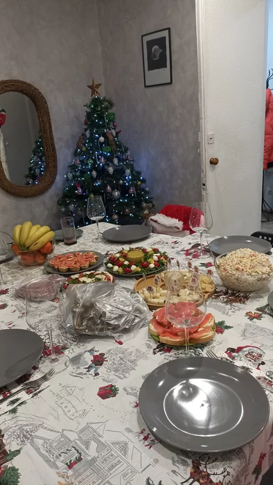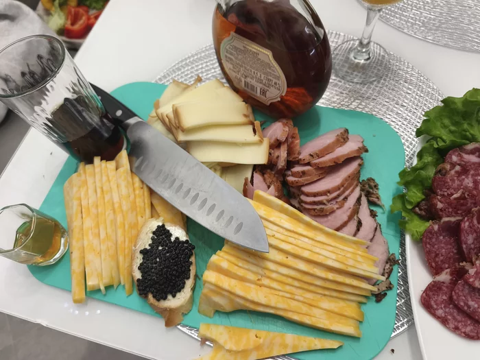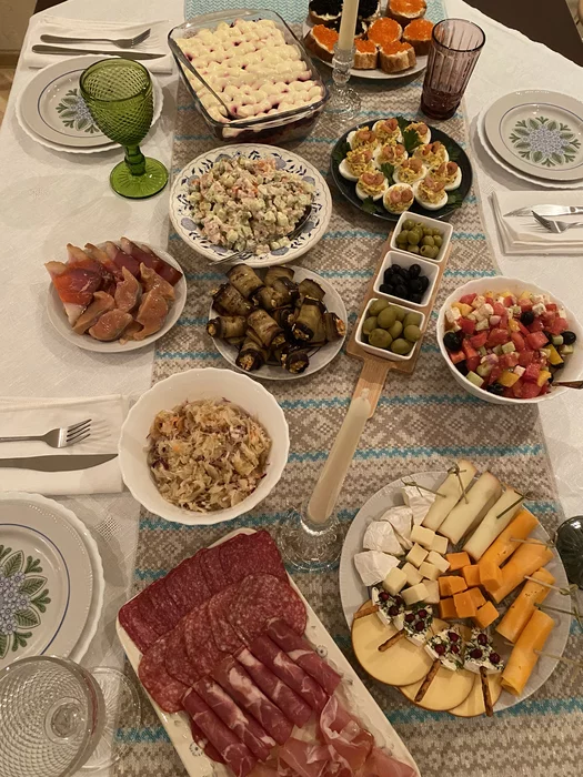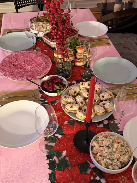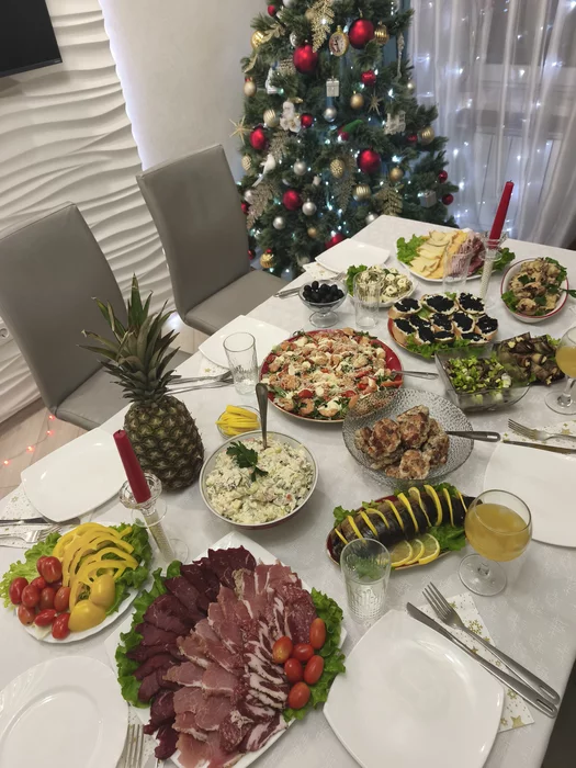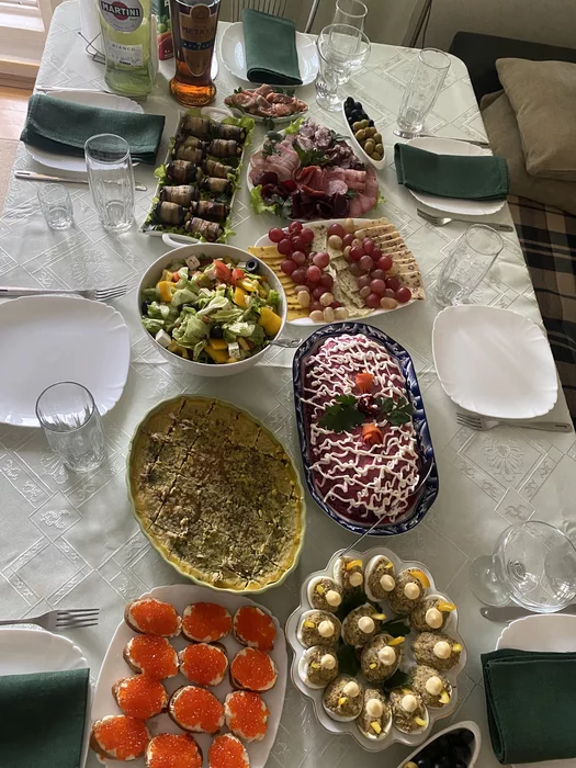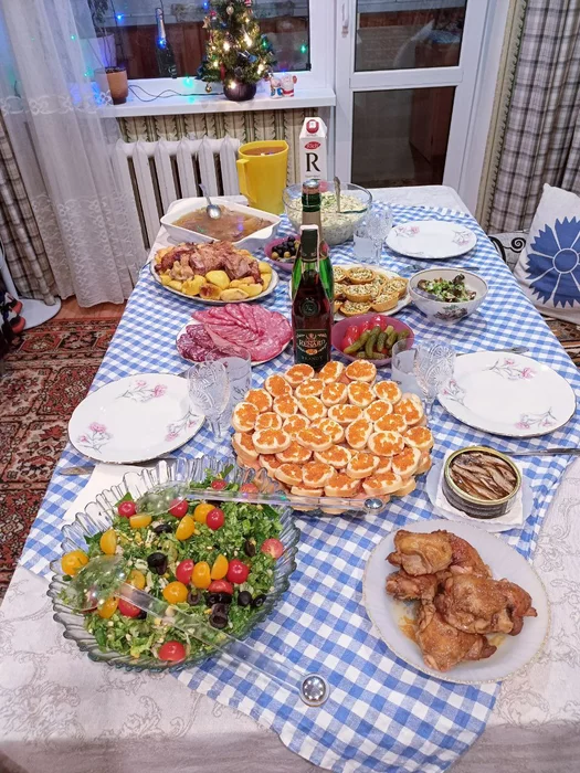 Ждём моих родителей и родителей жены. Стол наполовину накрыт. Ещё будет 3 салата , икра и закуски.