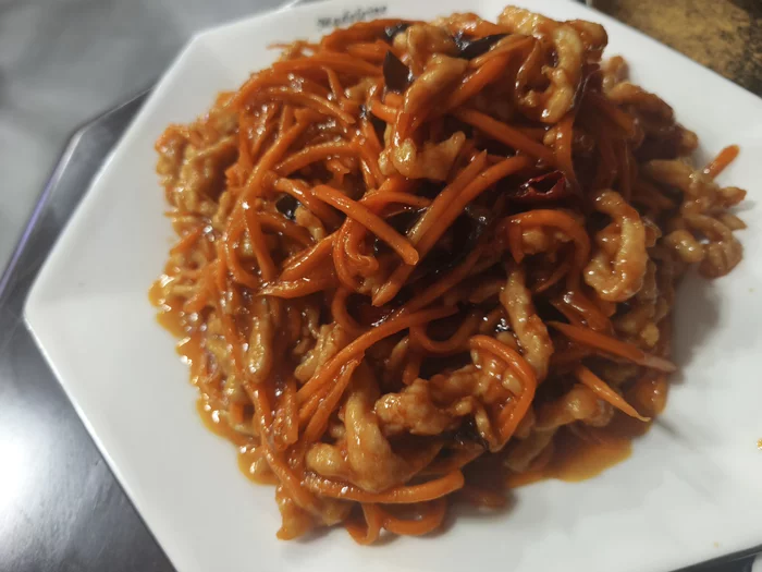 Первое блюдо с первого укуса знатно прочистило нос, я им прям заплакал. Еда из панда-кафе просто детская по сравнению с остротой этого блюда. Даже выбирая только мясо, которое к слову больше похоже на соевое, минуя красный перец, а его к слову пол тарелки, глаза наливались кровью. Хорошо что всё это можно запивать хорошим холодным пивком.