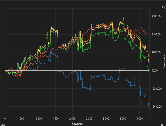 вот странно. На пати гораздо больше ёбиков, но выиграть у них казино не даёт. Хотелось бы, чтобы наконец пати отпустило, и выдавал сессии как раньше +1-1.5к$