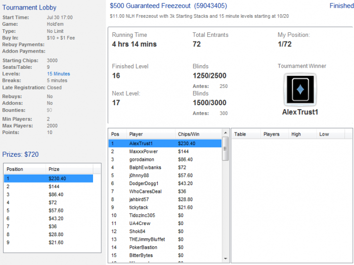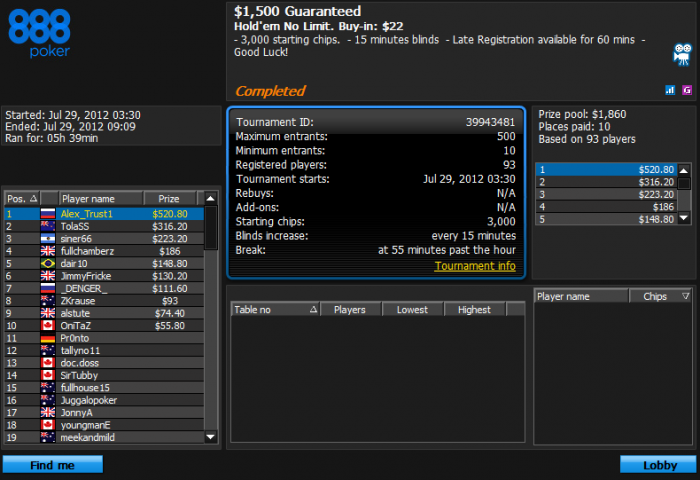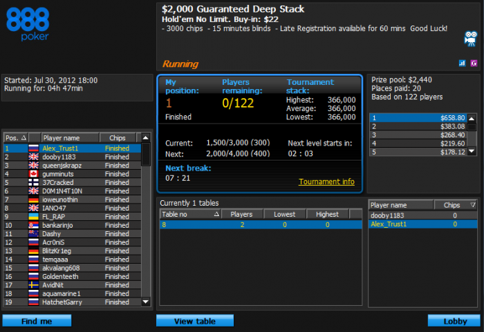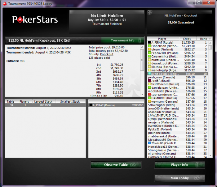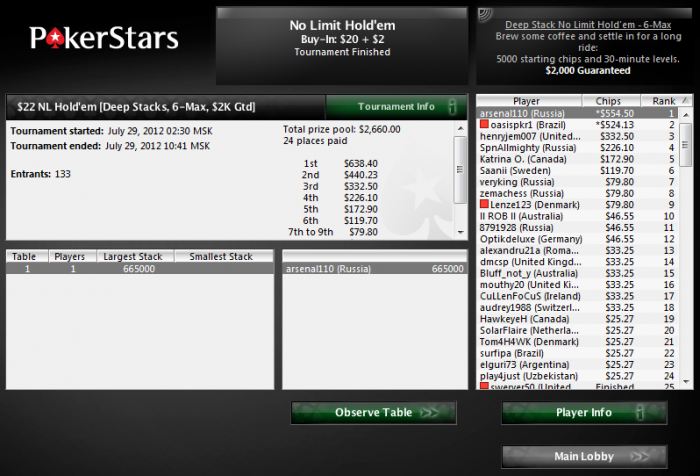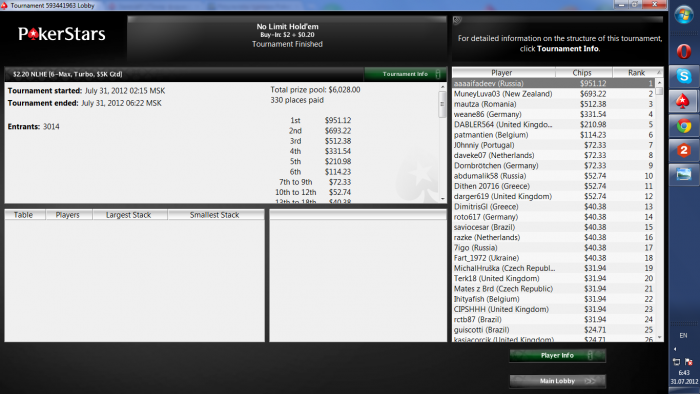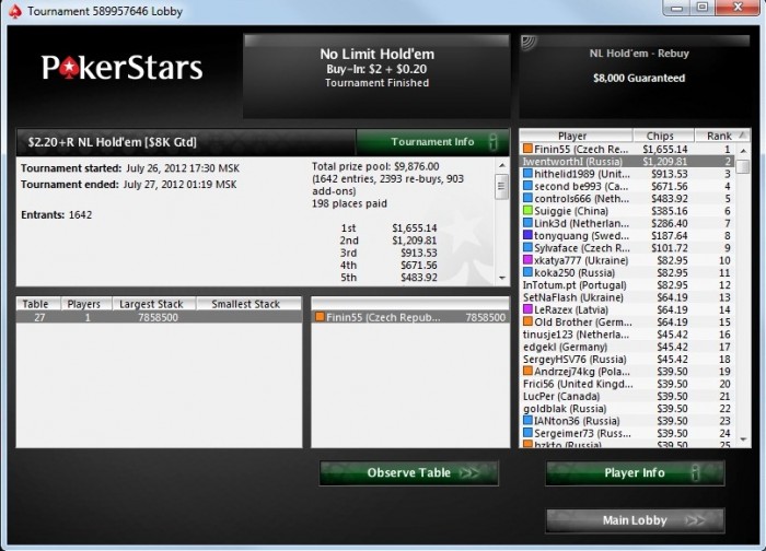PokerStars Турнир №589956253, Безлимитный Холдем Бай-ин: $4.00/$1.00/$0.40 USD 2553 игроков(а) Общий призовой фонд: $10212.00 USD Турнир начался 27.07.2012 12:45:00 ВВ