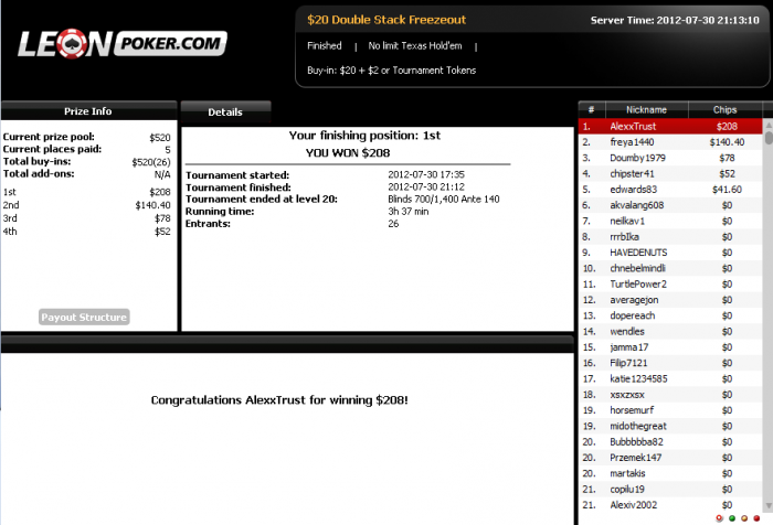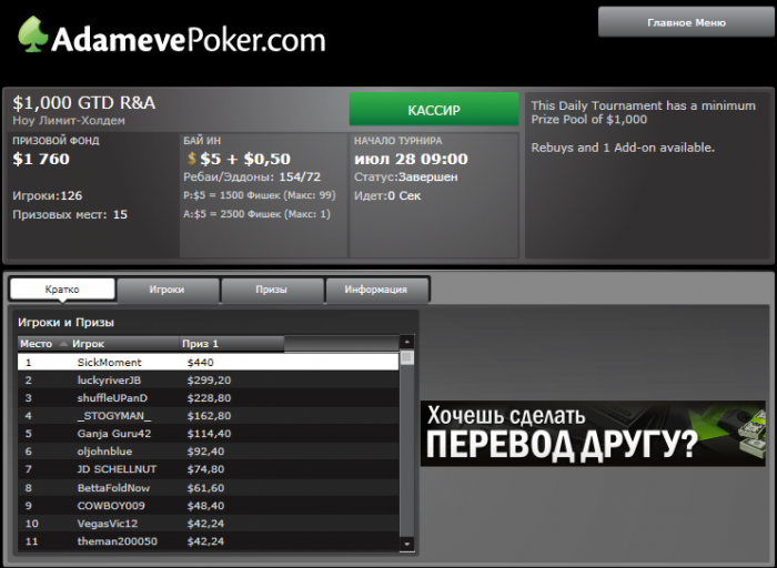 Вы заняли в турнире 1 место. На Ваш счет зачислена сумма в размере USD 1 276,47.