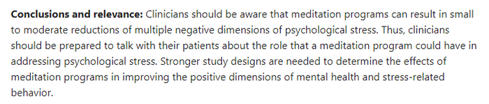 В твоем исследовании же, перевод : "Клиницисты должны знать, что программы медитации могут привести к небольшому или умеренному снижению нескольких негативных аспектов психологического стресса. Таким образом, врачи должны быть готовы обсуждать со своими пациентами роль, которую может сыграть программа медитации в преодолении психологического стресса"