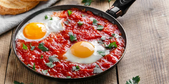 Блюдо номер 1 - яичница с индейкой, аджикой и травами.