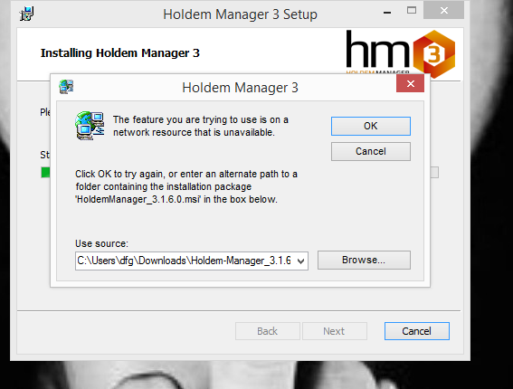 Google_Authenticator, для обновления ХМу нужен дистрибутив текущей версии там, откуда он был установлен. Либо восстанови его в загрузках (можно скачать по ссылке https://www.holdemmanager.com/download/index.php?product=HM3&channel=Stable&version=3.1.6.0)