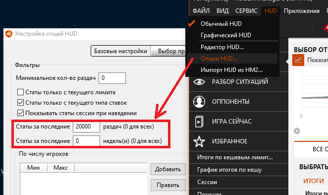 6yato6, в опциях HUD есть настройка сколько последних рук показывать, и сколько недель - значения не занижены? Может ты лимит поменял, и галка стоит показывать только статы лимита. Может руки импортируются не с тем временем - отчет по сессиям работает?