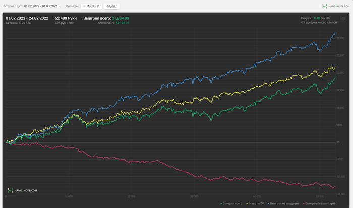 Февраль был экспериментальным, хотел отыграть много рук, но в последнюю неделю не смог заставить себя работать. Чисто покерных с евро столами (проблема в отображении которых по-прежнему не решена) вышло ровно 2000$ без РБ и ЛБ, что с учетом того, как складывалась первая половина месяца можно назвать неплохим результатом