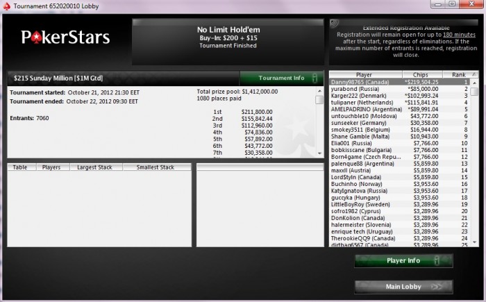 Binkkkkkk, just beat out over 7000 entrants and won the Sunday Million on @pokerstars !! Chopped 5 handed, got 8k more than first place :P