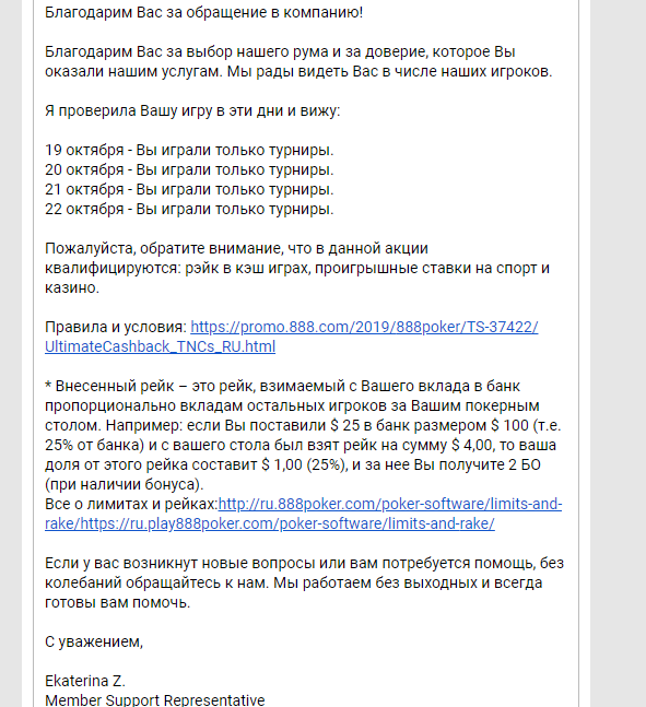 «На безрыбье и рак — рыба» Не все даже раков найти могут. У многих из РФ(может не только РФ) провайдер просто блокирует всплывающие окна, они просто не могут крутить без всяких там ВПН. А это тот еще мозго*б. Да и я например не за то, что бы пользоваться всякими сторонними прогами. Ну и расскажу о своей проблеме. Мне просто не приходит это колесо. У меня с всплывающими окнами никогда не было проблем, всегда все открывалось, пропустить это колесо точно не мог, сутками ведь сижу играю. Я думаю что не только у меня такая проблема, вероятно есть люди, которые так же не получают. Написал в лайвчат 888, они сказали у них тех. проблемы с этим, они разбираются. На мой вопрос, получу ли я позже это колесо за те дни, они говорят, что у них нет информации по данному вопросу. Ну а вот ответ на письмо, которое я писал им на почту.