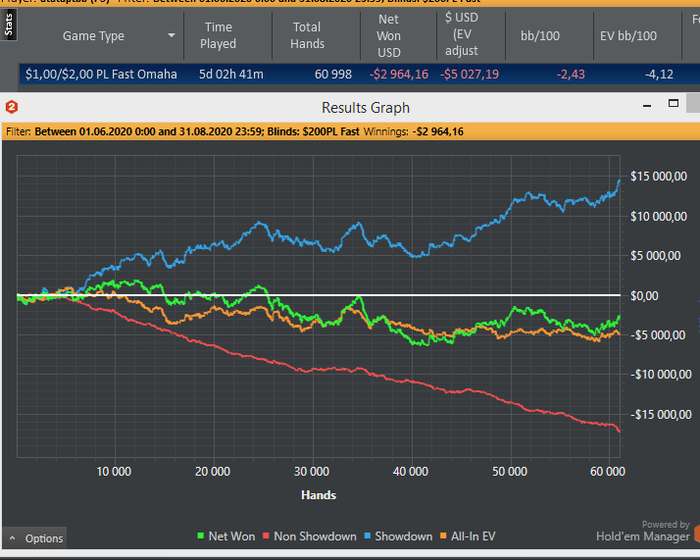Ну отрицать что апнуло было бы глупо ) это вообще очень опасно в омахе и я часто подвергался такому искажению. Я бы сказал что всегда. Ты хорошо отыгрываешь несколько сессий и начинает казаться что это потому что ты хорошо играл. И даже возможно так и было. Но что бы качественно отыгрывать ты прилагал к этому усилия, это не произошло само собой. После такого ты садишься играть, в не оптимальной форме/уставшим/не готовым эмоционально или просто потому что в погоне за продуктивностью хочется "правильно" потратить 1-2-3 часа свободного времени, в надежде разваливать на скилле, и по итогу не справляешься с давлением сложных решений. Скатываешься в В-С игру, проигрываешь и тебя мотает от состояния "как я понимаю эту игру" до "какое же я дно". Конкретно за сентябрь у меня было столько откровенно глупых действий(по факту скорее всего больше), сколько иногда я мог сделать за 1-2 сессии.