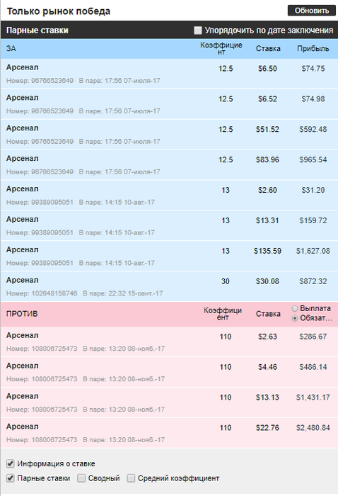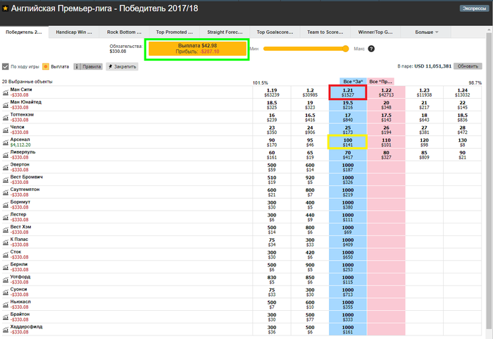 RampantKing, я ставил на победу в АПЛ 300 по кефу 13~(под спойлером скрины) и еще 30 по кефу 30.