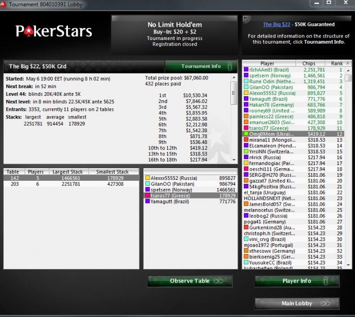 12/3353 в The Big $50k GT $22 (шел чл в топ16, но проиграл 2 аи коротким KK<AK, AK<KJ и собственная ошибка с ТТ)