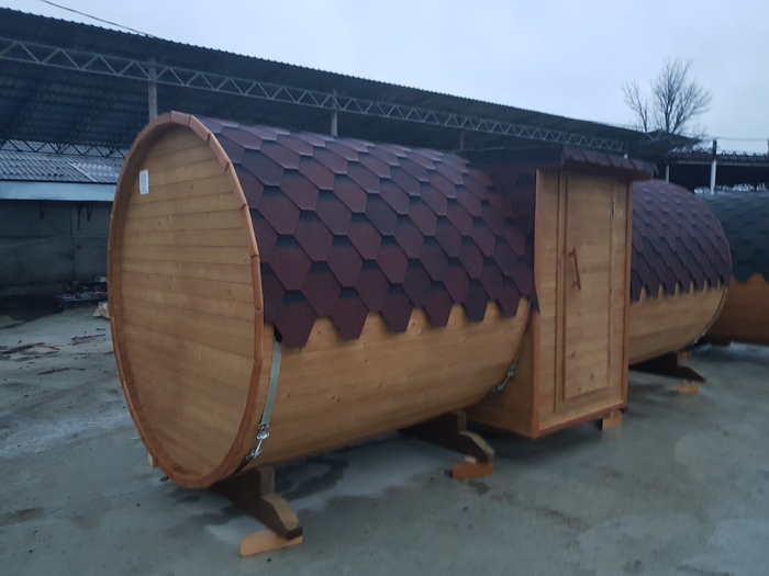 230k, шестиметровая. Внутри комната предбанник, слева баня два метра в длину (на полку я влажу целиком не сгибаясь), справа два с половиной метра комната отдыха со столом. Доставка, печка, установка включены в стоимость.