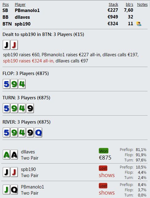 Не знаю за что старзы мне так мстят, но за один турнир я 4 раза проиграл такие выставления мастеру, который колет префлоп пуши с руками типа 85о. Видимо сыграю еще пару раз и сделаю перерыв до марта - выкидывать топовые руки я не могу когда опп пушит стек через руку, а выиграть не дает ГСЧ. Получается просто отъем денег. Кстати, после моего вылета, третий опп быстро уделал этого мастера. В финальной руке "мастер" слил префлоп выставление АК против К5 третьего оппа- тот собрал стрит. Молодцы, что тут скажешь.
