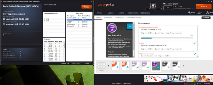 Tiamad12345, от 22 до QQ выполнено. включил впн набрал в поисковике патипокер, перешел по ссылке https://ru.partypoker.com/ переадресовали на с приписанными цифрами. скачал, миссия была стартована давно, потом клиент удалялся, за процессом не следил. после услышанных изменений на пати установил опять. поизучав новый интерфейс увидел о выполняющихся миссиях, но их сейчас все заело. Трекерами сейчас не пользуюсь, был НМ2, но он удален, (не научился им пользоваться - что с ним что без него один результат, да и чтоб не заблочили ненароком) играю один стол.