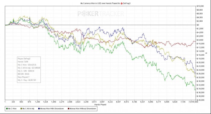Тем не менее очень недоволен последними двумя днями. У меня было что-то типа "тилта победителя" или хз как это назвать. Это когда выигрываешь долго, побеждаешь в сложнейших матчах и тут садится какой-нить нитовый фишок и давай играть играть по карте. А ты в него грузишь, попадаешь в топ, вскрываешь, где нормально вскрыть любого человека, который хотя бы иногда блефует, а там , сюрприз-сюрприз, снова тупо топ. Потому что не топ он никогда не ставит. Залил ему тысячи 4 на 3\6.