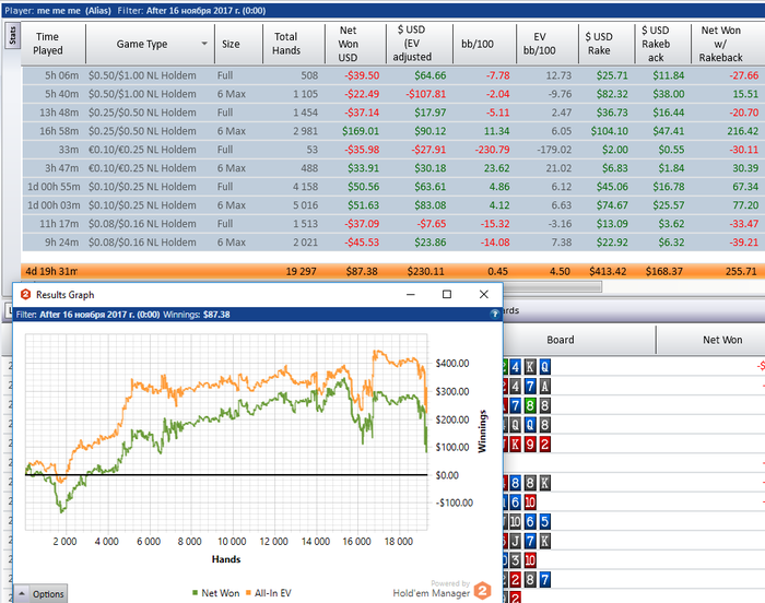 Чем это хуево? Раньше было заебаись. Миксую пс и чико. Я предпочитаю точность. Если я вижу сыгранные руки, мне подавай и $/hr и hands/h и time played с точностью до минуты. Я хочу знать в какое время в какой день недели в каком месяце сколько рук сыграл с 13 до 15ч и с 20 до 22ч и в таком ключе!!! Когда я играю пс с чико, то выходит что начинаем в одно время, а пс как бы записывает с отставанием 1ч. Я сыграл скажем 1.5ч, а в хм отобразится 2.5ч , т.к. хм думает что я начал не 1.5ч назад, а 2.5ч назад. Приходится в ручную записывать сколько откатал, и потом складывать. Но как мне это учитывать при анализе через месяц, полгода, год? Я люблю грузить базы, смотреть как играл в предыдущих годах. Сколько рук в час, в каком руме и в какое время. Ну аналитический склад ебла у меня, понимаете? Как пофиксить эту поеботу?