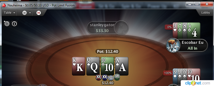 Это уже - НЕ омашная штука, а чисто фьюжная. Как получить каре тузов, не имея ни одного туза на префлопе и при этом выиграть раздачу.