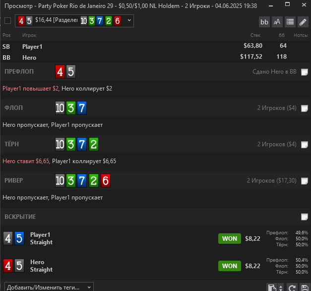 И первой же раздачей "рег" чек колит 250% терн с голым 7 хай фд - он же знает, что конкретно протиив меня это супер плюсовый колл и супер страта