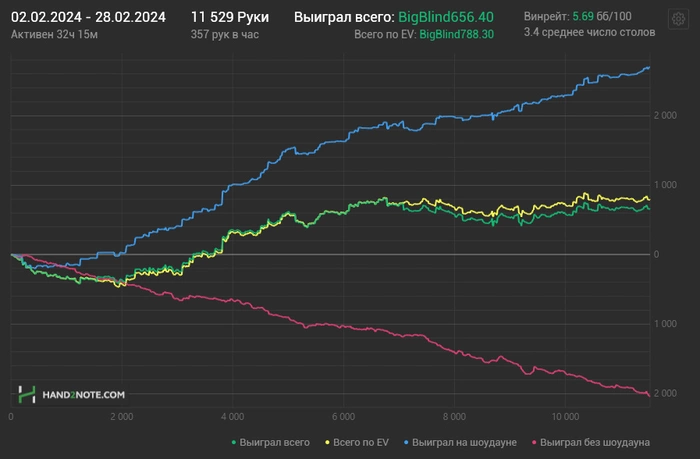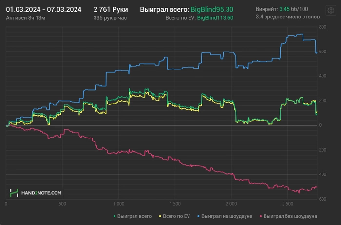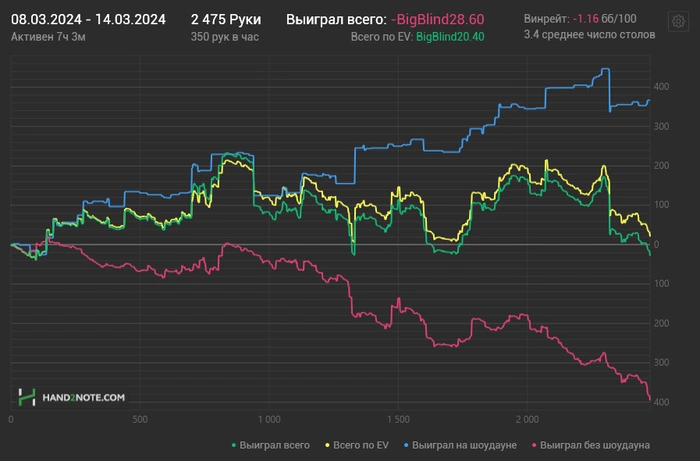 Винрейт не очень, особенно подпортила сегодняшняя сессия. Сделал ужасный колл с карманными КК и воткнул стэк в сет рега.
