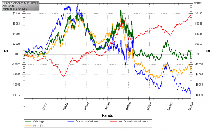 Конечно, мне было бы приятно иметь графики вверх во всех направлениях - и по жизни, и по деньгам, и по количеству столов обогнать forhayley и т.п. Все графики вверх! Но это невозможно. Если я ухожу от оппонента, с которым мне действительно интересно играть, я спасаю свой график в деньгах, но лишаю себя опыта и яркого события в жизни - этот график идет вниз. Если я могу себе позволить играть в ноль, я не буду никуда уходить - мне не настолько важен мой график в деньгах. Я его показал здесь просто в доказательство того, что я не заливаю деньги, но мой опыт и рост в покере в деньгах не выражается, это понятно любому читателю этого дневника.