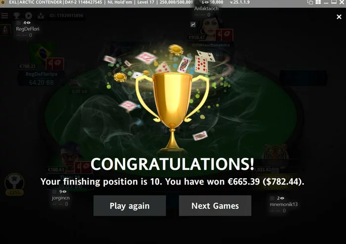 Почти 26 фишек у меня на 6000 турниров, конец-то это не 5к профита, но всё же хоть какой-то плюс есть🤫 Хотя этот великий похуй от моего антидепрессанта, наверное в минус мне пока идёт, очень много посредственных решений💩 И вроде бы интуиция говорит: "ФОЛД ФОЛД ФОЛД!!!", а я что-то сильно притуплён если честно и вообще её игнорирую и почти не слышу