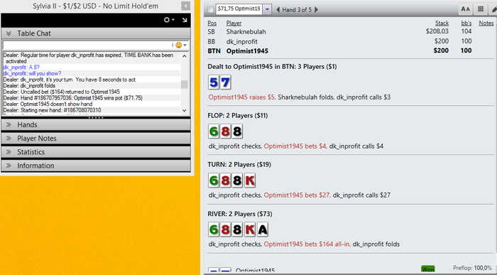(3 players, 2 are all-in) Results: $1,151.77 pot ($3.00 rake)