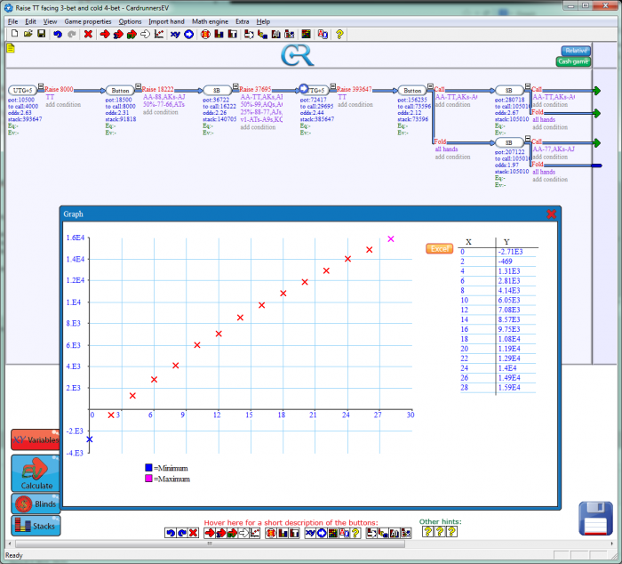Здесь график ЕВ нашего шува с TT в зависимости от количества блефа в руке 4-беттора. 28% на графике соответствуют тому, что из 4-бетов каждый третий это блеф. Как видим если оппонент вообще никогда не ставит тут колд 4-бет, то наше ЕА = -4000, а уже при нескольких процентах становится плюсовым.