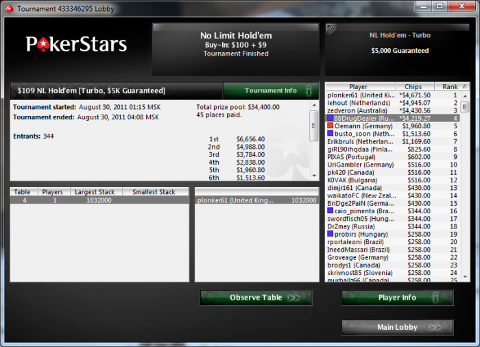 Играю второй раз УКР лигу, отыграл 6 уровней снова перестало складываться после 1го перерыва не доехал st8 flush в огромном банке, от стека осталось 1/2 начального, где-то треть среднего) Щас 2й перерыв старт через 30минут, как утроюсь отпишу