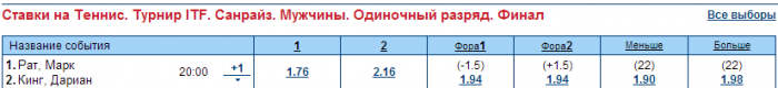 Но бетфейр был (ну и остается) прекрасен тем, что ты можешь сделать деньги ещё до начала матча ))) Например принять ставку на победу теннисиста А за 1,1 на 1000 евро (рискуешь 100 евро), а потом дождавшись, когда кэф на него поднимется до 1,15 поставить на него - тем самым уровняв плечи и получив на каждом из них +-й результат ))) И тебе уже не важен будет результат матча (хотя ты можешь разгрузить плечи так, чтобы на одном был профит больше чем на другом или на одном 0, а на другом +) - главное чтобы матч состоялся, иначе по всем ставкам будет оформлен возврат.