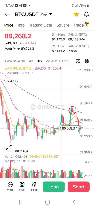 На рисунке красный кружок - после первой красной свечи можно было открывать шорт. Цена еще пару дней была в диапазоне 95К-96К, но я все не решался и ждал лучшей цены. Я не очень люблю ловить локальные вершины. И тогда я подумал, что опцион был бы не плохой заменой, так как в нем ограничены убытки и не нужно париться про стоп-лоссы.