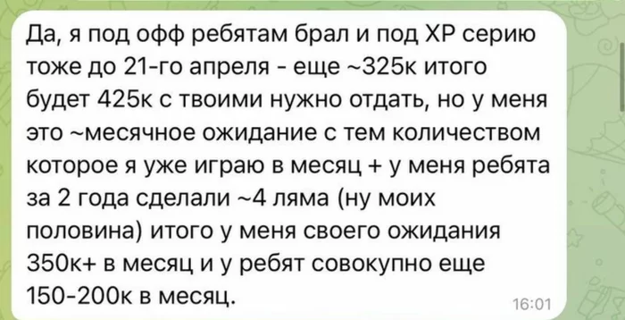 Если повнимательней посмотреть на скриншот, в просьбе одолжить 100к он рассказывает что за последние 2 года его конюшня профитнула 4млн из которых 2млн его + ожидание у него 350к в месяц, должно быть около 6-10млн баланс, получается просто и банально как на вокзале цыгане, обрабатывал друга откровенно вешая лапшу на уши чтобы тот точно дал денег, и это при том что это не левый богатый чел с околопокера а человек с которым 18 лет дружили в том числе и семьями. 👏
