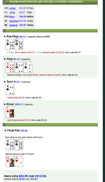 PokerStars - $0.05 Ante $0.01 NL (6 max) - Holdem - 6 playersHand converted by PokerTracker 4CO: 338.4 BB (VPIP: 31.03, PFR: 17.24, 3Bet Preflop: 20.00, Hands: 29)