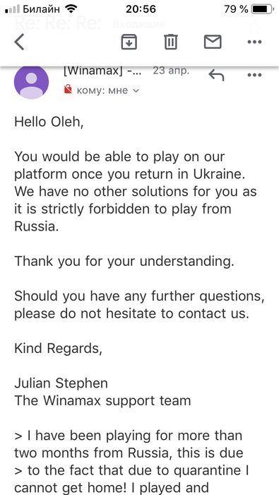Вот перевод! Я если честно не понимаю зачем уже второй человек просит у меня скрин,как будто я это придумал) Вы сможете играть на нашей платформе, как только вернетесь в Украину. Других решений для вас у нас нет, так как играть из России категорически запрещено. Спасибо за Ваше понимание.