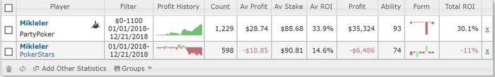 Msemin @ 21.12.2018 В онлайне потрудился достаточно скромно и по кол-ву и по резам. Справедливости ради, чуть ли не половину сессий отыграл далеко не в А-игру, и даже не всегда в B, что было связано с рядом рабочих моментов. По факту - около 1800 турниров с профитом около 30к (а с учетом 3 входов по 5к, где я саданул от себя около 7к еще меньше), что для такой дистанции нормально, но с забавным расхождением в разные стороны на Пати и Старзах. При этом особенно весело, что, если смотреть по ПТ4, то на старзах ЕВ/ББ - 13, а на Пати - 1(!!!), но ПТ4 показывает, что я вообще в этом году на Пати проиграл 50к, так что я хз, как он в принципе считает) Недобор большой в обоих румах, но опять же - исходя из предыдущих статов, я хз вообще, что у трекера в "голове", так что фиг с ним.