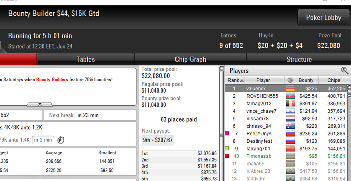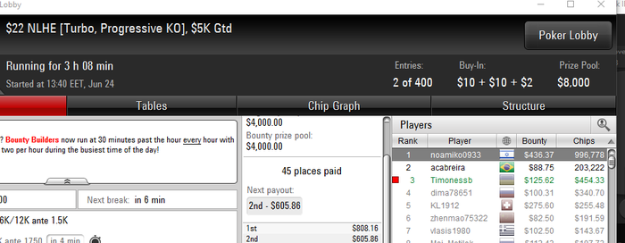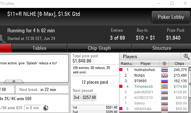 третий день,плюсовый. Играл отстойно вылетел на бабле 109 нока на старзах запушив 35бб 99 в рейз с утг и кол кол кол кол от бичей думал норм зарестилю а там АК мне показали и я не втащил как всегда - просто бред! Плюсанул тоже баксов 800 сегодня! Сделал 3 финалки на 888ках и на старзах было много дипчиков - ничего серьезного!