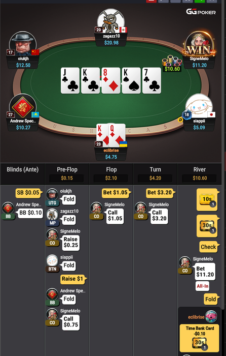 Ага,рассказывай. А еще ты выбрал ветку с флопа чисто рвачески по руке,а так же имеешь ровно 0 блефа. Еще и ривер не можешь догадаться блокфолд сыграть.