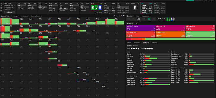 Ну так получается в реале мы бет-фолдим если не будут? Я на 10 процентов запихаю все, что до ривера тянул. У меня не будет здесь фолда и колла на такой сайз. Может это и не правильно но написал как есть. В реальной игре подобное крайне редко встречается у меня.