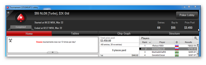 Поиграл вчера кеш 3/6. Пока похоже на какую-то херню, жуткая нудятина. Концентрации хватает на 40 минут максимум, потом уже просто не понятно что и зачем происходит, но это только для меня, состав стола может за это время полностью поменяться и будет происходить моё раздевание. Так что буду для начала играть сорокаминутные сессии, постепенно увеличивая зону комфорта, ну и осваивать эти кеш премудрости, с кем играть, с кем не играть, на кого прыгать в позу, а от кого бежать как от огня. Из трёх игр больше понравилась пятикарточная хай, по количеству столов, оппонентам и экшену. Курш хл тоже был неплох, но думаю он редко очень собирается. А вот пятикарточная хайла показалась совсем грустной, тут может просто состав совсем неудачный был. И ещё такое ощущение, что сдают просто отвратительно, это, конечно лишь ощущение.