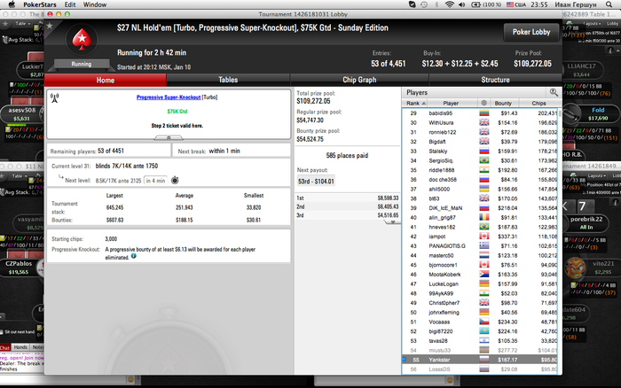 Проснувшись в 3 дня,сел катать долгую сессию до 2ух ночи,вылетев 96ым в биг 8,201 в биг 11 с АА,31ым в турнире по 3$, увидел приглашения друга на хом покатушки.приехал, на эмоциях вылетев так дерьмово в 3ех турнирах которые тащил одновременно,к 7-ми утра обнулил всех уехав +19к(на блайндах 5/10),залип дома в сериал,хотев лечь спать,получил приглашения от Феди на турнир по 2500 тоже как хом покатушки,вылетел баблом,затем пока играл получил предложение приехать в подполку на турнир по 5к.Приехав в катран,обнаружил 6 колек(хотя обещали 3 стола),вылетел за час с 20бб(так как орги очень умно поступили,сделав структуру 50/50 50/100 100/200(на этих я сел) 200/400 400/800).ВРемя уже 22-00,мое состояние не сложно представить,позвонив мне Лида,пригласила к себе в катран на 1/2 по курсу 50.Кароче в кратце:я был в размене на 600$ к середине ночи,факт был таким,что 3ое людей были в размене больше чем 5к