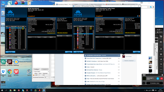 Поляной на лотосе очень был приятно удивлен!В целом очевидно,что пора прекратить как Лидик Лудик гнаться за крупными заносами(хотя за 6 лет регулярной игры на пс в килополянх,могли бы уже и дать что-то занести)и катать турниры с филдом 300-1000 человек.Всем,кто хочет зарабатывать покером,рекомендую так делать