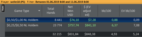 Постараюсь вернуться к отчётам по декадам, это меня мотивирует катать больше. Хоть и количество рук не главное, но с моим тайтовым стилем мне здесь видится больший профит. Примерные ориентиры 25к и меньше за декаду плохо, 25к-35к- хорошо, 35к+ отлично. Правда сейчас лето и днём игры совсем мало, но стараюсь сейчас больше часов уделять катке.