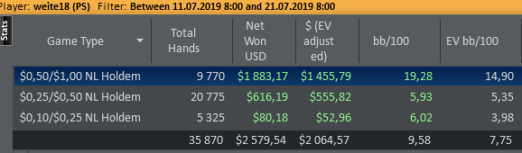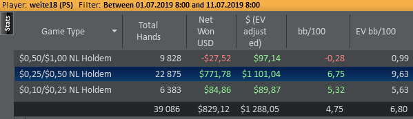 Поспешил на счёт соточки Июль В целом хорошо, по рукам скорее всего рекорд за всё время и это в июле 2019! Появилось больше работы вне покера в ИТ сфере, на август несколько поездок запланировано - не уверен на счёт часов в покере в этом месяце, но хочется по 100к выкатывать и не только за счёт большого количества столов.
