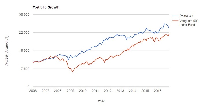 Отрезок небольшой, но хорошие инструменты для подобного вида инвестирования (ETF с низкими комиссиями) появились относительно недавно. Обратите внимание, что в момент сильнейшего падения рынка в 2008-2009 такой портфель не так уж сильно пострадал. Так что даже если не побьёте S&P 500 на дистанции, то, по крайней мере, точно будите меньше нервничать.