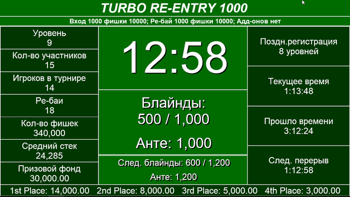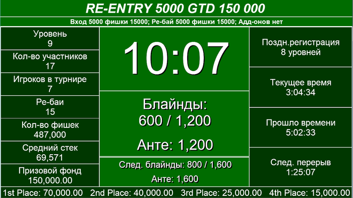 Далее самый пожалуй актуальный вопрос. Почему гарантия заявлена 45000. А у вас призов на 30000. Отвечаю. В турнирах все наши гарантии заявленные в расписании общие, т.е включают в себя призовой фонд и фонд баунти. Это значит что 45000 гарантии в этом турнире распределяются следующим образом 30000 основной призовой фонд который виден в призах и 15000 фонд наград за выбивание, который мы тоже кстати показываем на экранах.