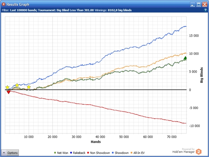 Фильтр 1: Большой блайнд менее 301. выборка - последние 100к рук. Ев +13 бб/100, получил + 11 бб/100. Тут видны небольшие горы. Но так как все линии между собой зависимы - смело валим всё на диспу))))