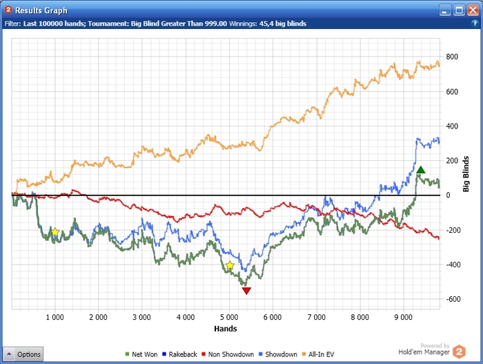 Так как при фолде на СБ мы имеем -50 бб/100, то любой результат хуже, будет говорить о просадке по ЕВ и не оптимальной игре. Разницу между ЕВ и тем, что выдало ГСЧ не буду указывать.