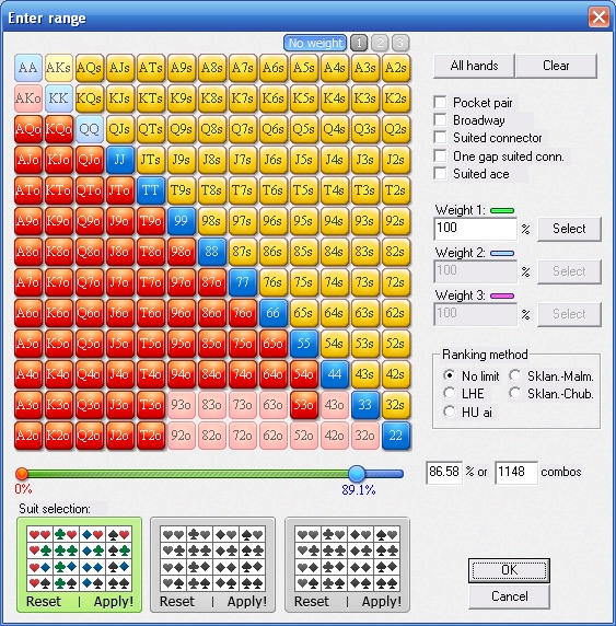 Общие выводы по комплиту и колу: Играю со слишким узким спектром изолейта. Хотя большинство раздач проверял на правильность действия - по шансам банка ни одной ошибки не нашёл. Т.е. эквити руки было с запасом по сравнению с шансами банка. Вот примерно - общий спектр для комплита и кола: В общем, кол и комплит у меня в плюсе, так что, пока не вижу смысл делать какие то изменения - для этого лимита годится. В дальнейшем, обязательно займусь чейнджем спектра (но пока хз, как должно быть точно правильно)